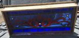 LONG RED AND BLUE STAINED GLASS TRANSOM WINDOW WITH RONDELL