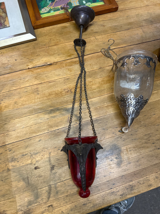 RED GLASS VASE IN MTAK HANGING HOLDER WITH EAGLES
