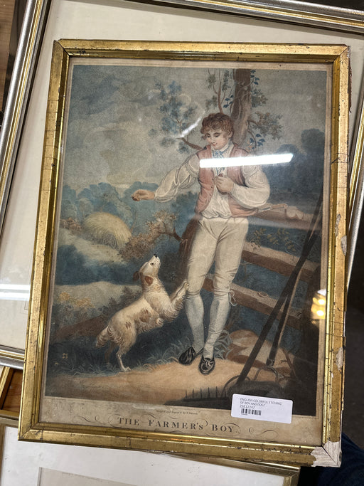 COLORFUL ENGLISH ETCHING OF BOY AND DOG