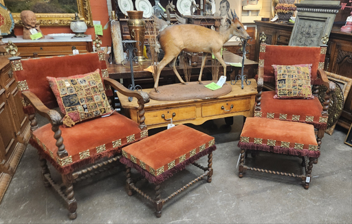 Original price $2,650.00Current price $2,495.00| /SET OF EAGLE FINIAL BARLEY TWIST ARM CHAIRS WITH OTTMANS