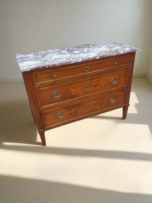 $2,250.00| /LOUIS XVI PUDDING MARBLE TOP 3 DRAWER INLAID CHEST