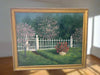 GILT FRAMED OIL PAINTING OF A YARD WITH WHITE PICKETT FENCE AND FLOWERS FLOWERS SIGNED RAYMOND TRINKLEY