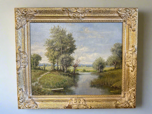Original price $675.00Current price $585.00| /BURLED FRAME LANSCAPE OIL PAINTING ON BOARD OF MEADOW WITH CLOUDS