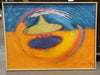 MODERN ORANGE AND BLUE OIL PAINTING WITH FLYING SAUCERS-AS FOUND